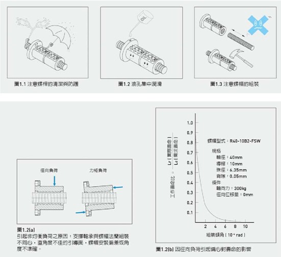 ?? 轉(zhuǎn)造級(jí)滾珠絲桿適用于精度較不高的場(chǎng)合,如包裝機(jī)械…等,即可選用精度 較不高的支撐軸承組合。特別重要是,避免軸承支撐座與螺帽的偏心,造成 負(fù)荷的不均,如圖1.2。不均勻負(fù)載含徑向力及扭矩,參圖1.2(a),皆可能造 成故障及壽命減低,如圖1.2(b)。