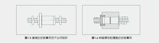 (7)滾珠絲桿建議使用伸縮式之保護(hù)套來保護(hù),以避免受到環(huán)境中塵埃或鐵屑的 污染。若有碎屑或異物進(jìn)入螺帽內(nèi),則會(huì)造成螺桿只剩十分之一壽命。採(cǎi)以 伸縮式須要在法蘭上加螺紋孔以固定之,如圖1.6。此項(xiàng)特殊之需求,請(qǐng)告知HIWIN.