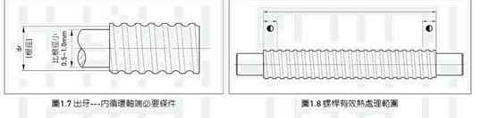 (9)滾珠絲桿熱處理時(shí)于靠近肩部加工的螺紋牙部份有10~20mm長(zhǎng)度須保持軟 化,以便于加工肩部。此區(qū)域會(huì)標(biāo)示記號(hào)于HIWIN圖面上,如圖1.8。如您有 特殊之要求請(qǐng)與HIWIN連繫。